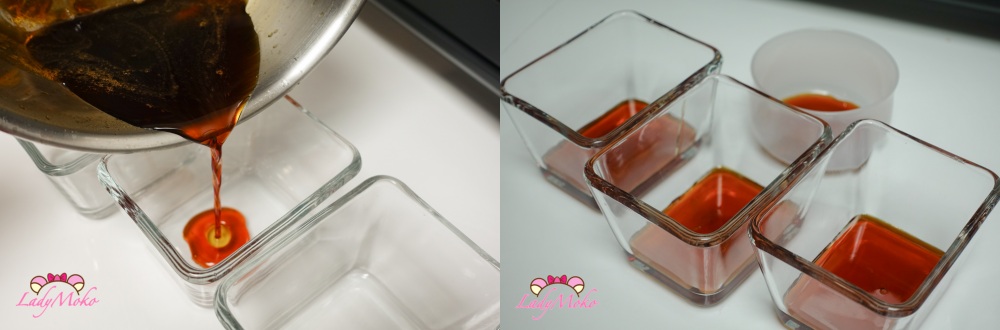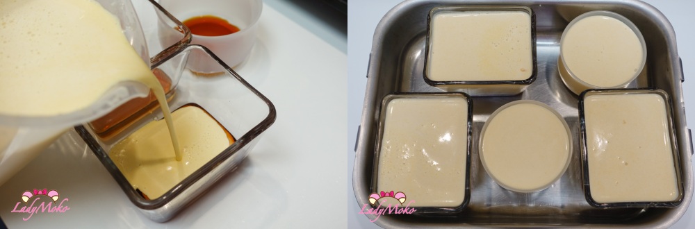 6. 做好的焦糖液馬上平均倒入布丁杯中。