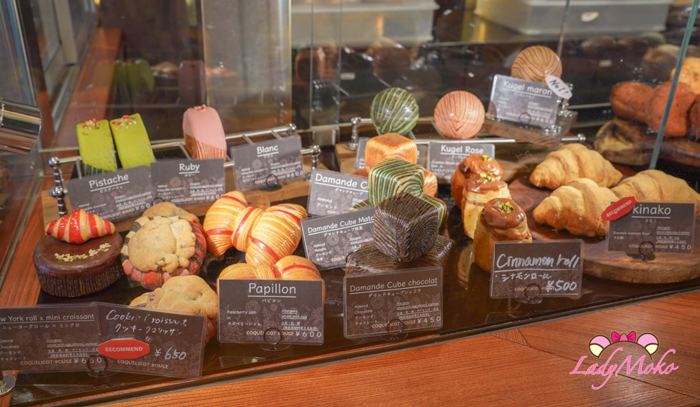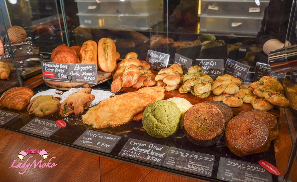 繼續往櫥窗裡面看,除了可頌類的麵包,也有幾款法式與日式結合的麵包,值得一提的是有扁可頌、大蒜麵包、抹茶口味的Kouign amann、多種鹹口味的稻穗麵包等等,價格介於 400-500 日圓之間。