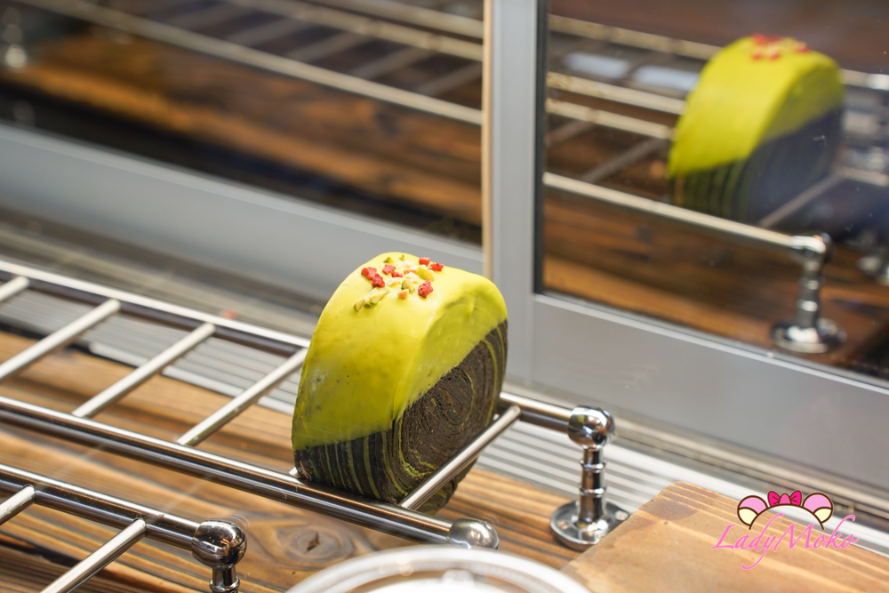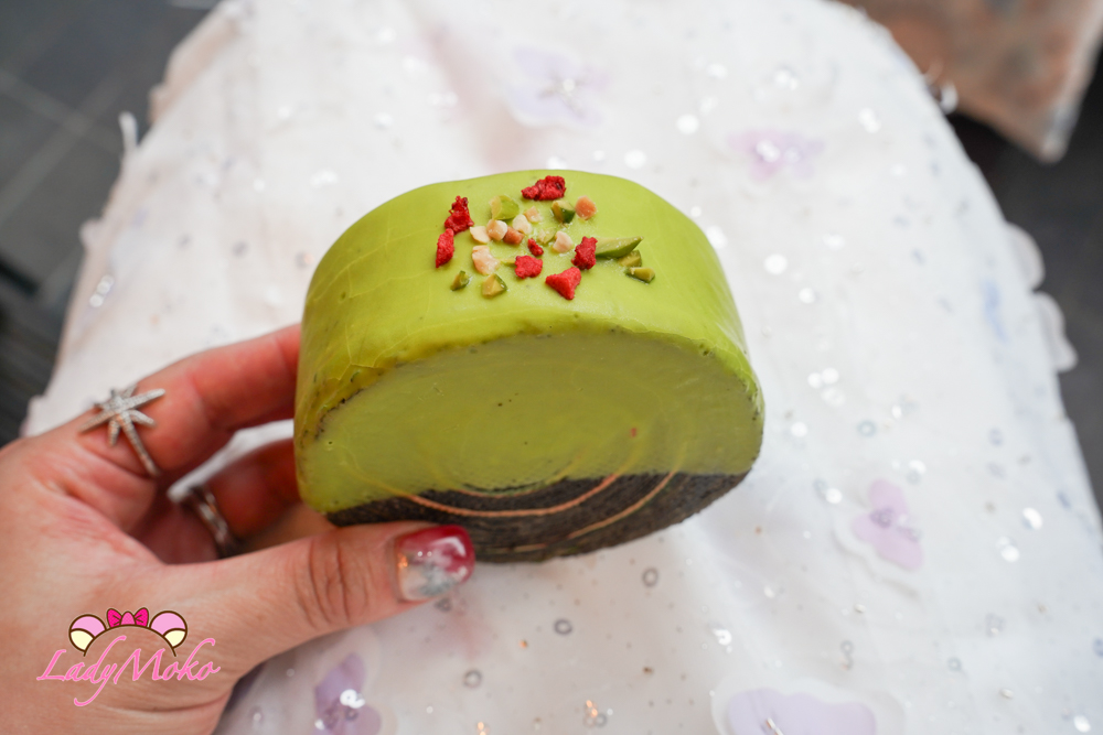 造型真的可以給滿分。外層裹上一層薄薄的抹綠色巧克力,表面再灑上開心果、覆盆莓與杏仁等三種不同顏色的碎粒點綴,色彩層次豐富又協調,非常鮮豔漂亮。