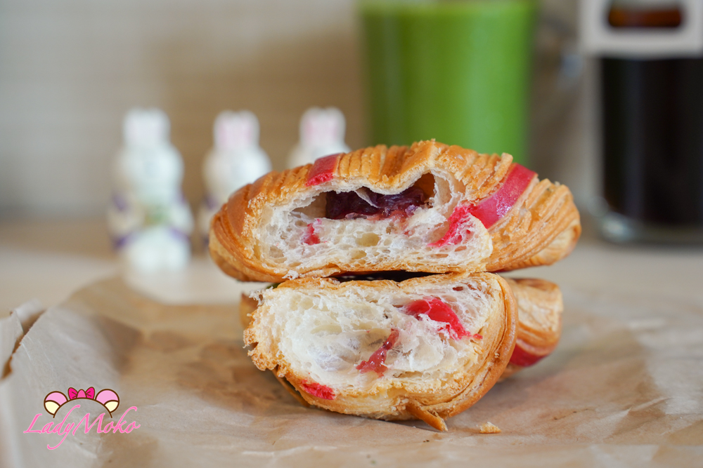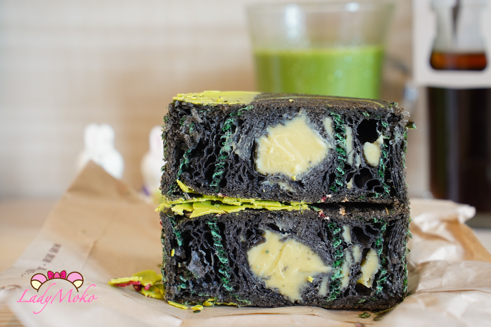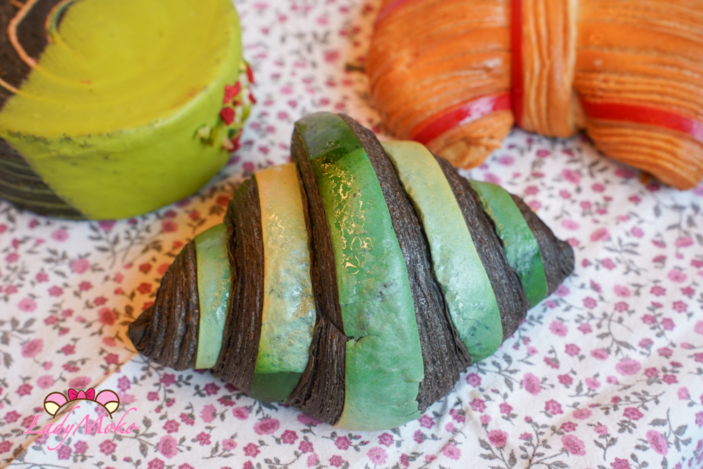 這款可頌外觀是綠色與黑色相間,看起來相當吸睛,不過實際切開後,裡頭夾的抹茶醬份量偏少,整體抹茶味道也比較清淡,沒有想像中那麼濃郁。