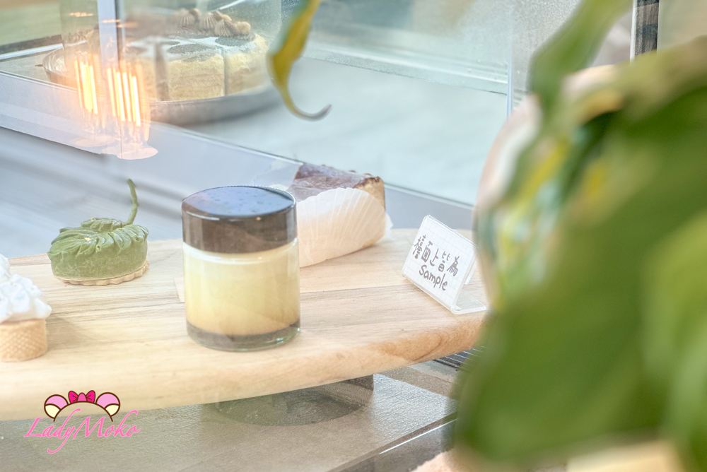 再來就是此行最期待、也是慕名而來的抹茶龜背芋蛋糕!實品比想像中迷你一些,但精緻度非常高。蛋糕以「抹茶劇院蛋糕」為概念設計,抹茶慕斯中間夾著茉莉杏仁蛋糕與一層薄薄的覆盆子果醬,入口時帶有顆粒口感,微酸微甜的香氣點綴其中,既能嚐到層次又不會搶走抹茶的風采。
