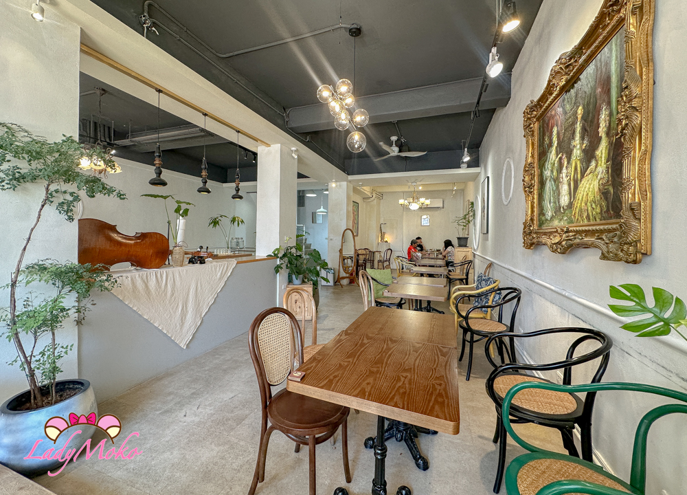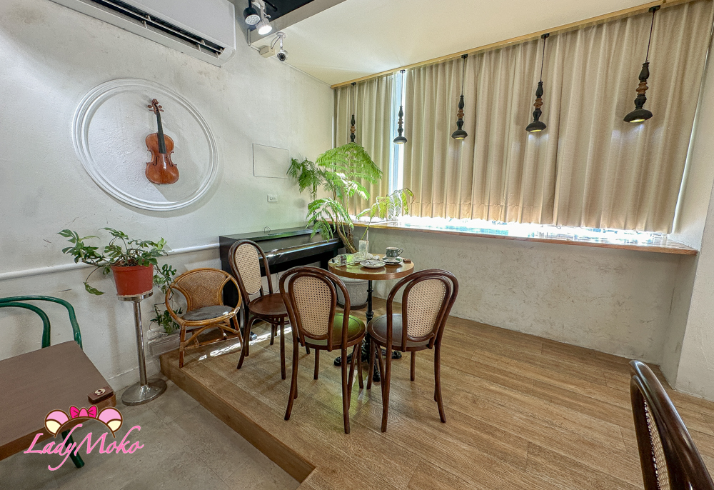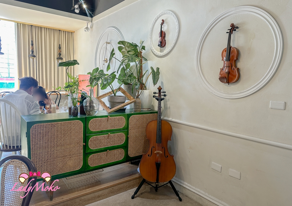 店內裝潢走典雅路線,搭配觀景植物、鋼琴、小提琴、大提琴以及古典畫框等裝飾,整體氛圍高雅又充滿藝術感。