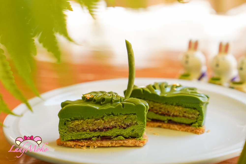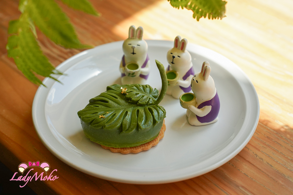 蛋糕上的「龜背芋」造型吃起來像是抹茶白巧克力甘納許,入口即化,底部則由脆餅乾承接,讓整體多了一份酥脆層次。整體而言,抹茶濃郁度滿分、口感細膩,是小巧卻充滿驚喜的甜點!