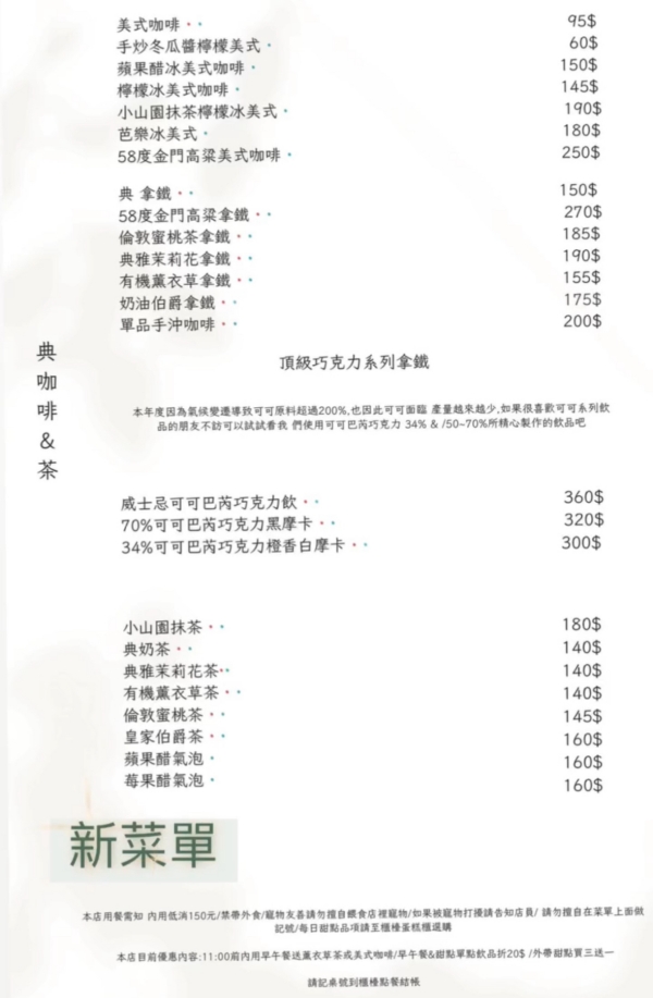 ☕️飲品選擇多元,光是咖啡和拿鐵就有很多種口味,還有頂級巧克力系列拿鐵,不喝咖啡的也有抹茶、奶茶、花草茶、伯爵茶、氣泡飲等選擇,價格介於 60-360 元之間。