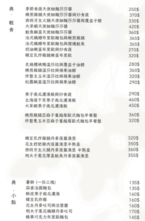 🥘「Grace Café 典.咖啡」除了可以喝咖啡吃甜點外,也有提供非常多選擇的輕食與小點,像是義大利麵、布里歐麵包、沙拉、濃湯飯、早餐盤等等,價格介於 135-420 元之間。