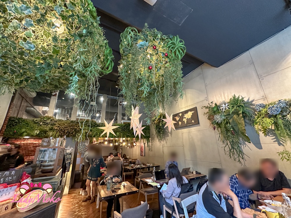 「GreenHouse 早午餐」的logo看起來是一朵長在溫室裡的玫瑰花,店內佈置了滿滿的植物裝飾和星星,氣氛相當好,椅子也很好坐,桌椅都是木質調,看到二樓也有座位區,座位很多,非常適合朋友一起來吃飯聊天,也看到不少客人是帶著筆電來工作,店家有提供WIFI可以使用。