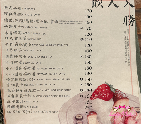 ☕️飲品的選擇非常多,有咖啡、拿鐵、各種茶、可可、抹茶、焙茶、氣泡飲、果汁,甚至還有啤酒與紅白酒,價格介於 100-250 元之間。