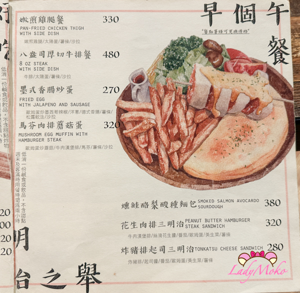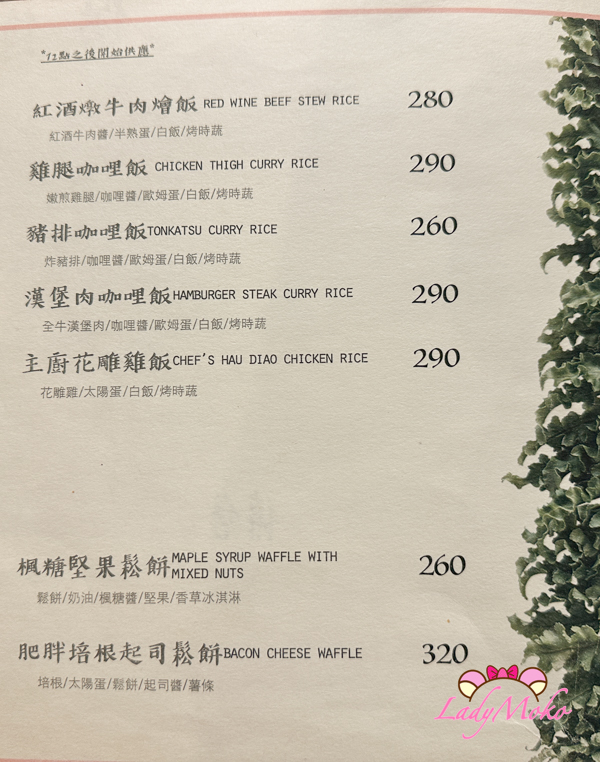 🥗餐點選擇更是多樣,想要來吃個午晚飯或是早午餐都沒問題,餐點包括:紅酒燉牛肉、咖哩飯、花雕雞飯、鬆餅、早餐盤、優格盤、沙拉、漢堡、炸物、早午餐盤、三明治、舒肥肉品等等,價格大概在 200 多到 400 多之間。