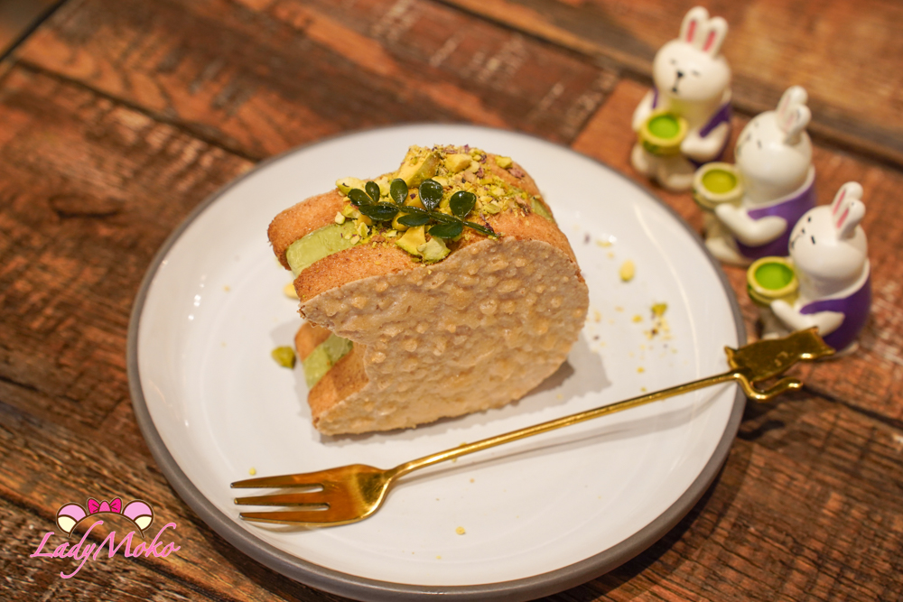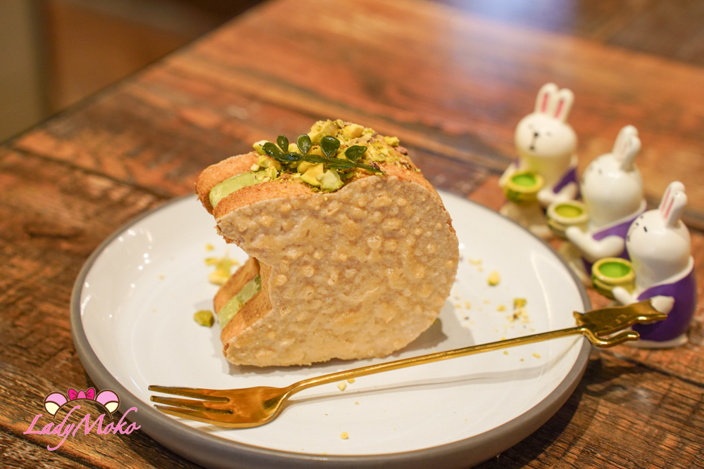 做成貓咪的造型相當可愛,達克瓦茲本體口感鬆軟,內餡的開心果味也夠濃郁,是好吃的!
