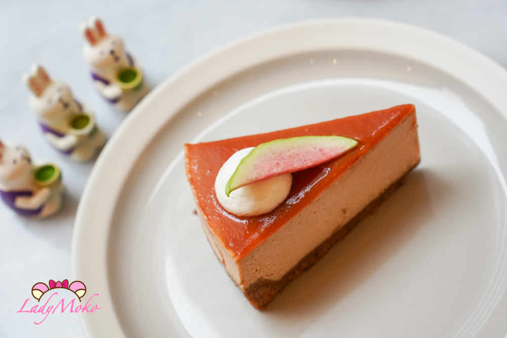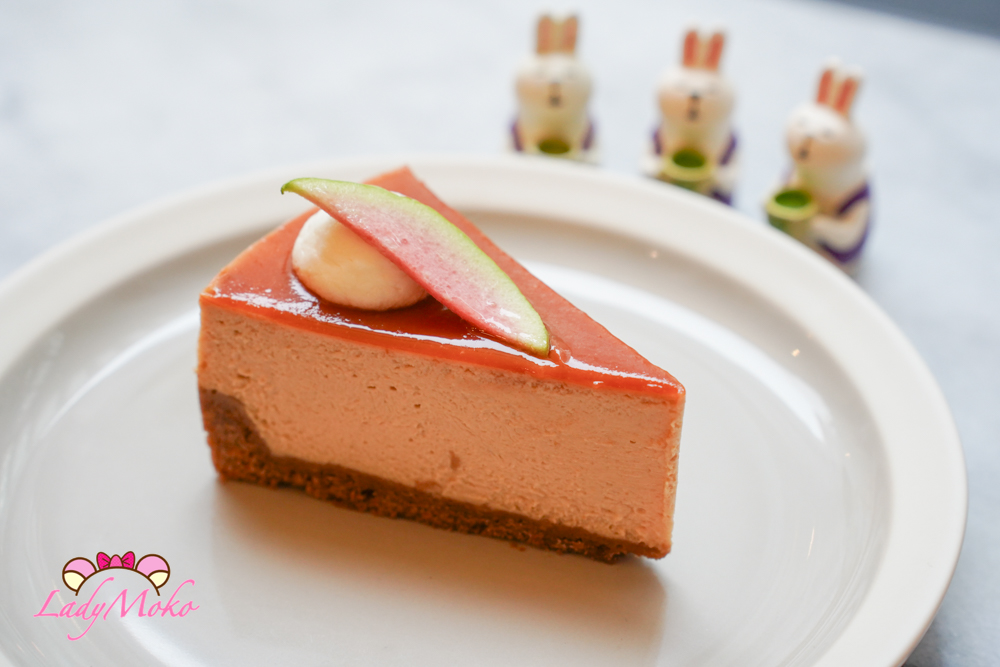 甜點上桌時簡單俐落,沒有多餘的盤飾,份量精緻卻剛剛好。底層的餅乾酥香又好吃,紅心芭樂起司蛋糕本身綿密濃郁,但完全不膩口,不是傳統美式重乳酪的厚重感,甜度拿捏得恰到好處。上層覆著一層薄薄的紅心芭樂果膠,並以一片薄切紅心芭樂點綴,看似簡單卻很好吃!難怪這款甜點會這麼有名,一吃就能明白原因。