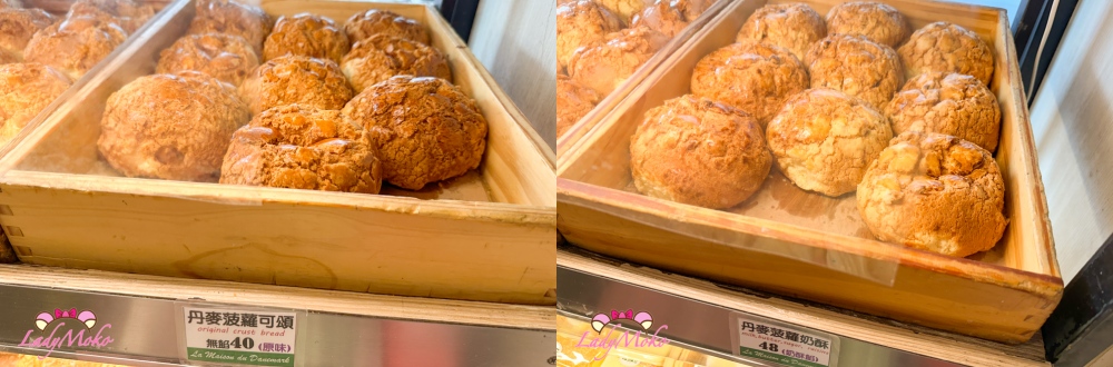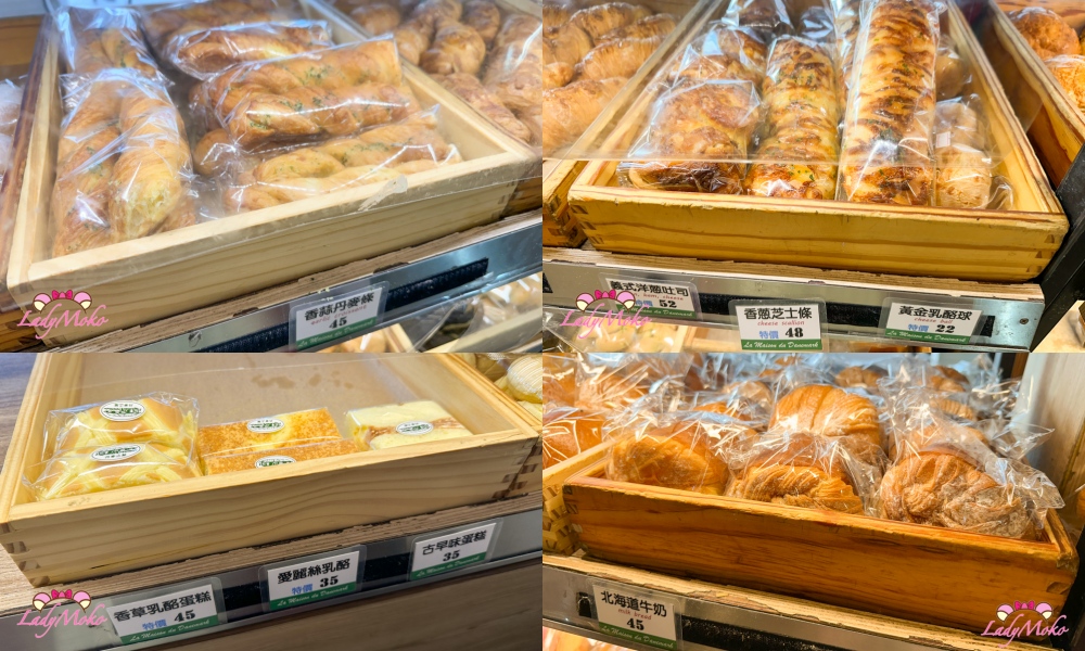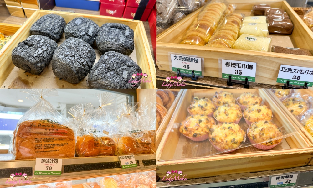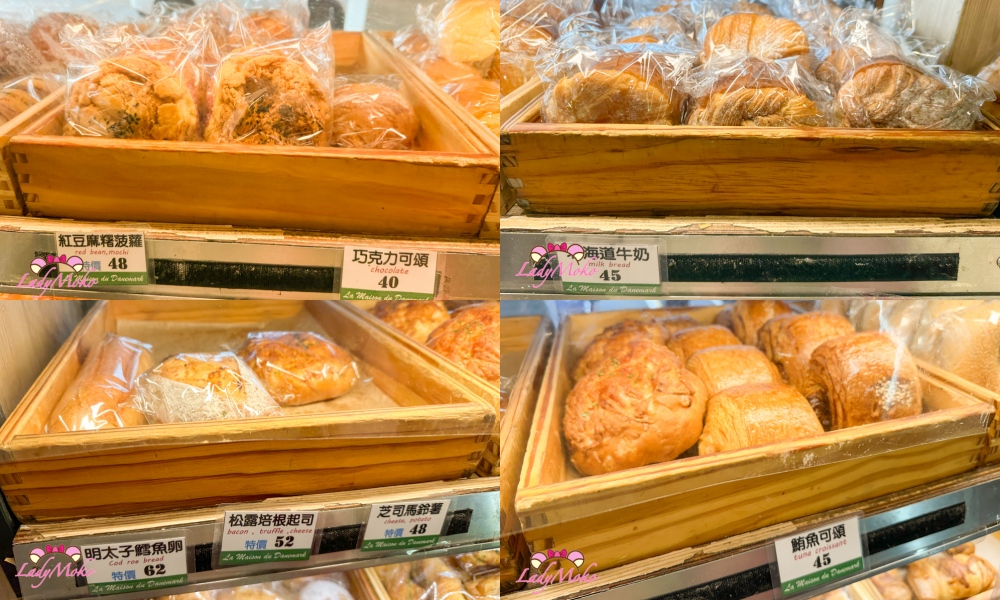 稍微拍了一下麵包的款式和價格,麵包選擇真的太多太多了,看到多款台式傳統麵包、吐司,另外「丹麥之屋」最有名的就是多款、多口味的可頌麵包菠蘿麵包,是一間可以買到台式與法式麵包的店家,多數麵包的價格介於 30 幾到 60 幾元之間,價格很是親民。