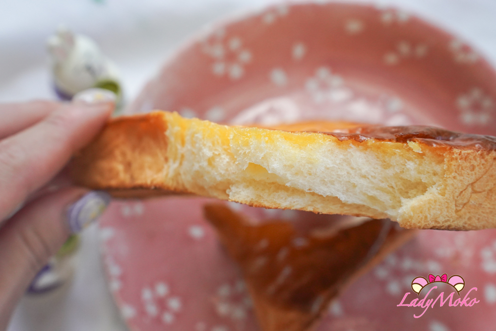 吐司外皮超薄透,沒有一般吐司邊會有的乾硬口感。身為平常會把吐司邊挑掉的毛毛,完全吃光光,一口也不留(笑)。