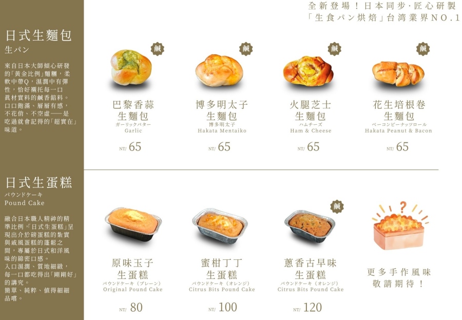 除了生吐司之外,還有販售鹹甜不同口味的麵包、生麵包、生蛋糕。
