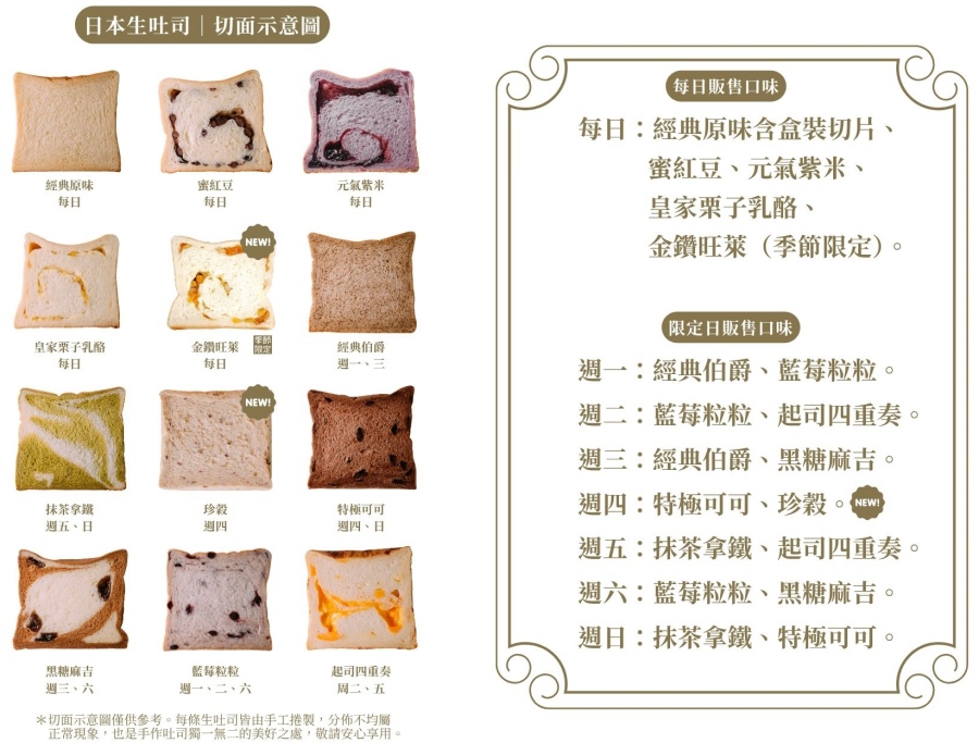 生吐司口味選擇超多,但僅有少數口味是每天供應,多數口味是每天輪流供應,底下毛毛有附上一整個星期的口味出沒表。