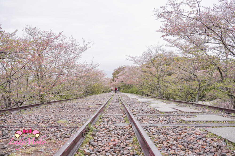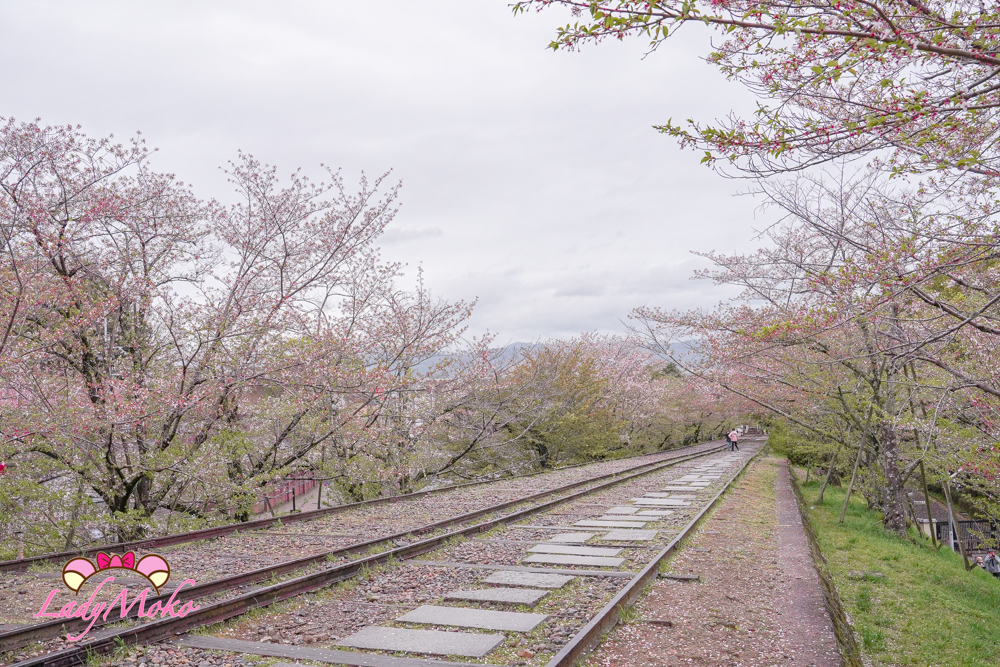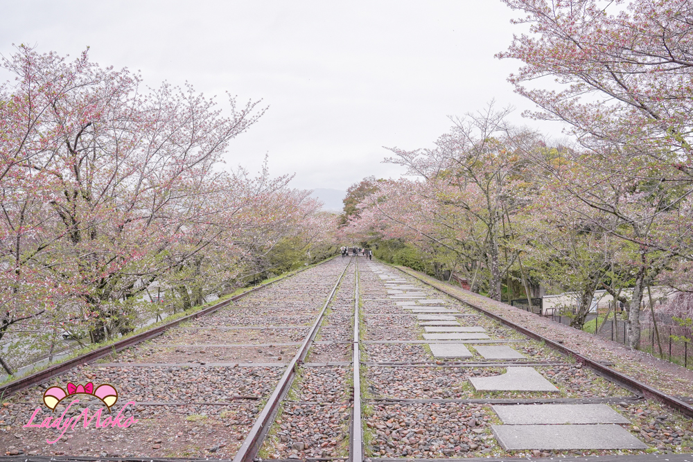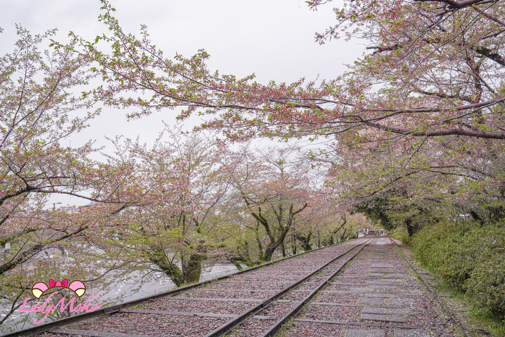 每年 3 月下旬至 4 月上旬,鐵道兩側的櫻花樹盛開,形成壯觀的櫻花隧道。鐵軌筆直延伸、櫻花從兩側傾瀉而下,是京都極具代表性的春日風景之一。