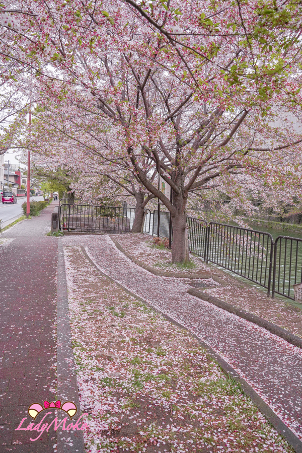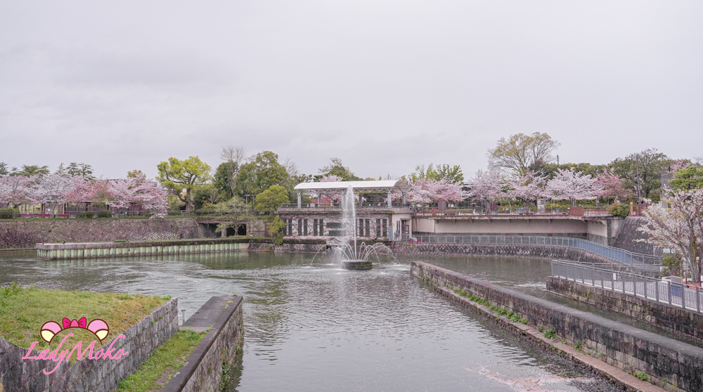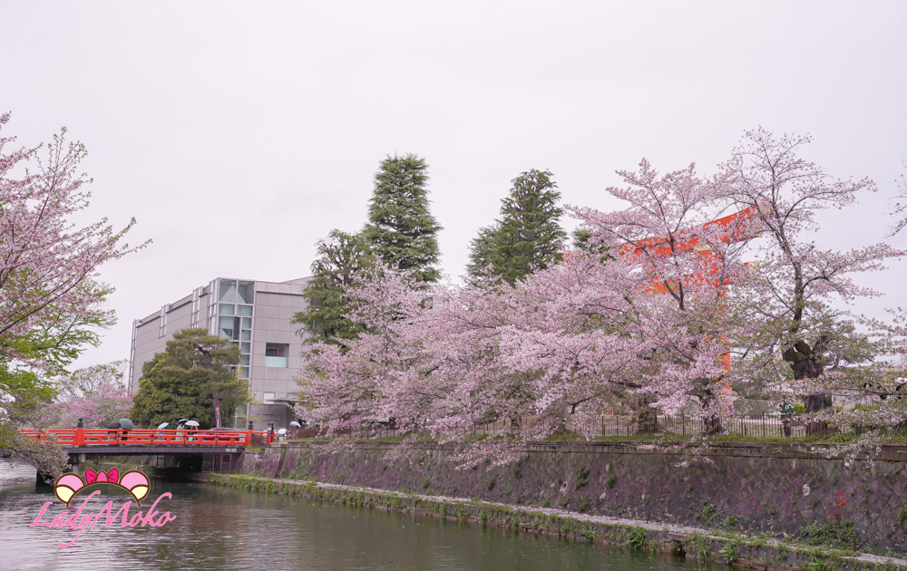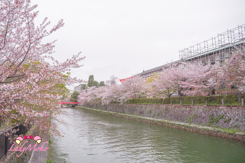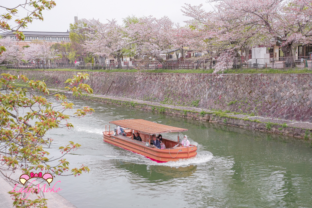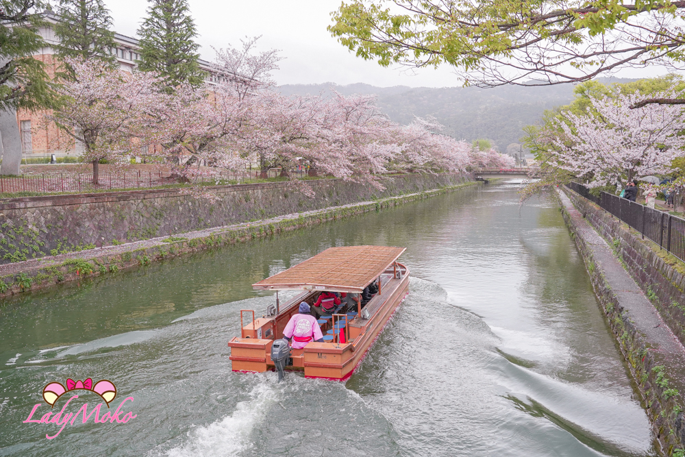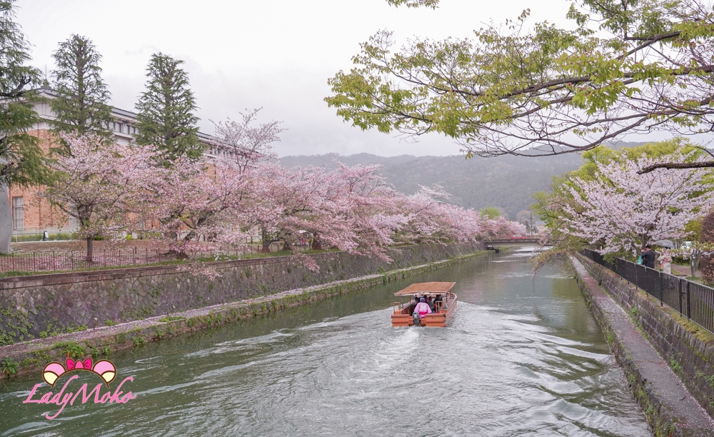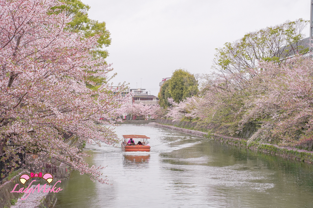 繼續順著水道走,會來到google maps上標示的「岡崎疏水」,這裡甚至被稱為「岡崎櫻花迴廊」,每年固定時間還有提供遊船賞櫻的活動,當天剛好是遊船的最後一天,幸運的遇到營運中的十石舟,配上粉綠相間的櫻花河岸,真的太美!