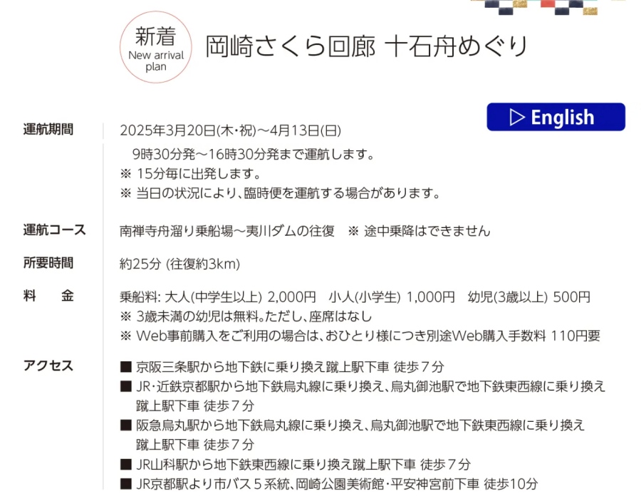 岡崎櫻花迴廊遊船網站:https://kyoto-tabi.or.jp/tour/250320jfj/