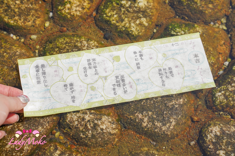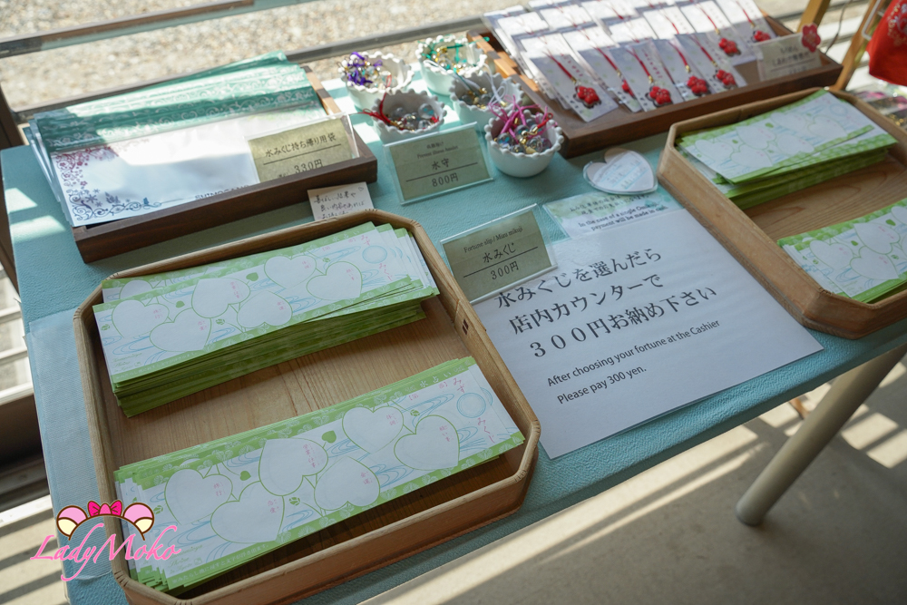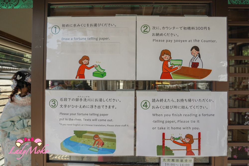 簡單來說,就是先挑一張「水みくじ」,一張是 300 日幣,結帳後,走下台階到旁邊的「御手洗川」浸濕,「水みくじ」上面的字就會浮現了,最後可以選擇將「水みくじ」帶回家,或是綁在「井上社」旁邊。