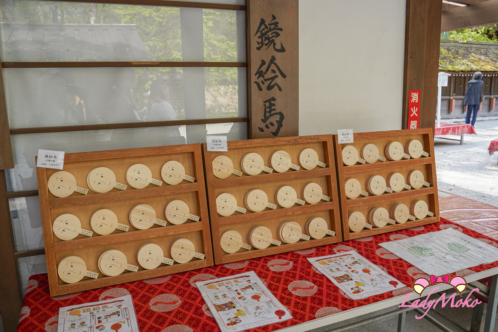 走進去後馬上就是一面掛滿「鏡繪馬」的牆,在河合神社,有一個非常特別、也是超人氣的體驗,就是這個手鏡造型的繪馬,繪馬上面已經描繪出臉部輪廓,而最特別的是,這不是拿筆隨便畫一畫,而是要用自己平常在使用的化妝品來幫繪馬化妝!