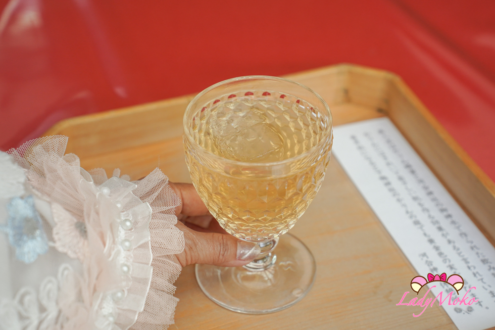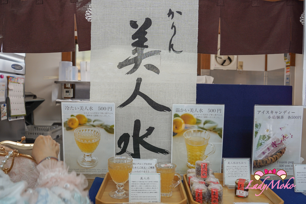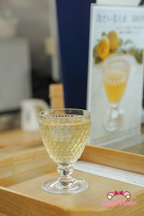 美人水可以選冰的或是溫的,據說是用下鴨神社境內生長的花梨樹所結的果實,再加上河合神社境內的御神水一起製成的果汁,花梨富含維他命C、丹寧酸、檸檬酸等,都是讓肌膚變美不可或缺的營養成分,喝起來微酸微甜,滿好喝的!