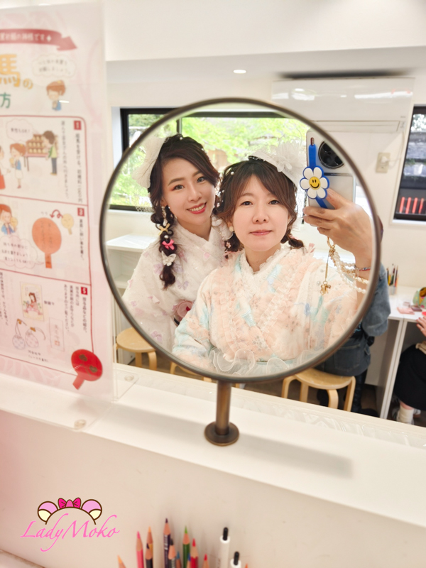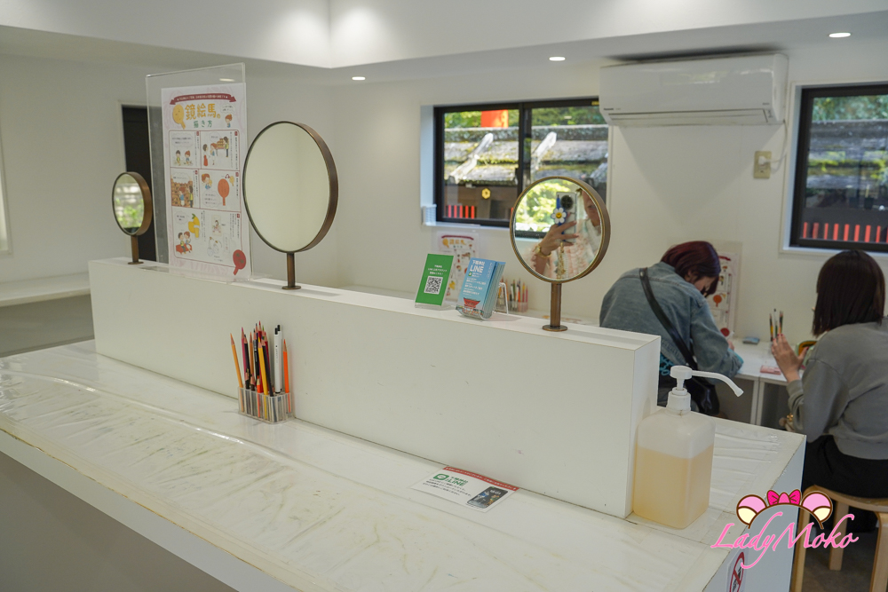 買好鏡繪馬可以到旁邊的「鏡繪馬化妝室」坐下來好好幫繪馬畫上自己喜歡的樣子,雖然建議使用自己的化妝品話,如果沒有帶到全部的化妝品沒關係,現場有提供色筆可以自由使用。