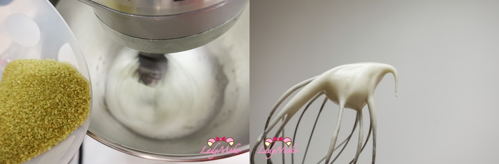 3. 再來打發蛋白,打發至起泡後,加入一半的糖,繼續打發至泡泡越來越多,再加入剩下的糖,打發至有彎彎的勾勾(7-8分發),蛋白霜就完成了。