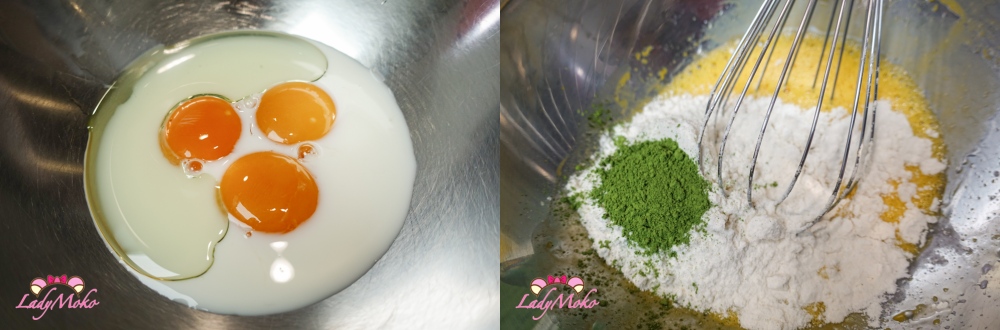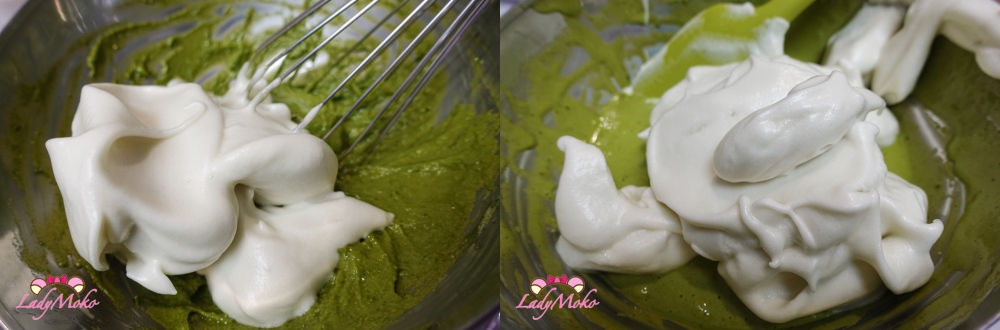 2. 加入過篩的抹茶粉和低筋麵粉,輕輕攪拌均勻至無顆粒。