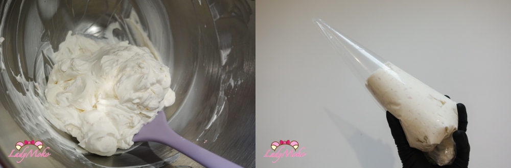3. 將完成的鹽漬櫻花奶油乳酪香緹裝入擠花袋中,不用特別裝花嘴,放冰箱冷藏備用,蛋糕體涼透後就可以使用了。
