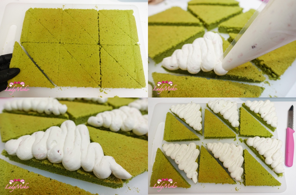 2. 切好之後擠上「鹽漬櫻花奶油乳酪香緹」,份量算得剛剛好,可以不用省的大方擠在蛋糕上,不過最後還是要留一點點作為邊角填補之用。