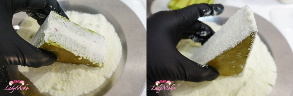 沒想到成品意外地驚艷!柔軟的抹茶戚風夾著香濃奶油乳酪內餡,外層再薄薄裹上一層奶粉,不僅增添了奶香層次,視覺上也更療癒可愛。