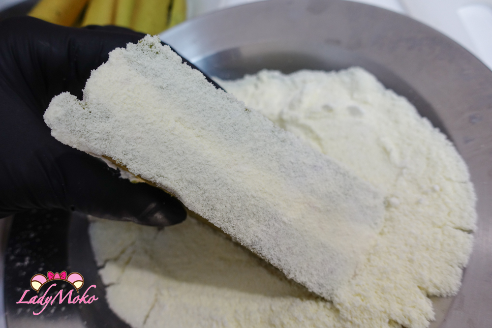 5. 將奶粉倒在深盤中,將塗有香緹側面都均勻沾上滿滿的奶粉。