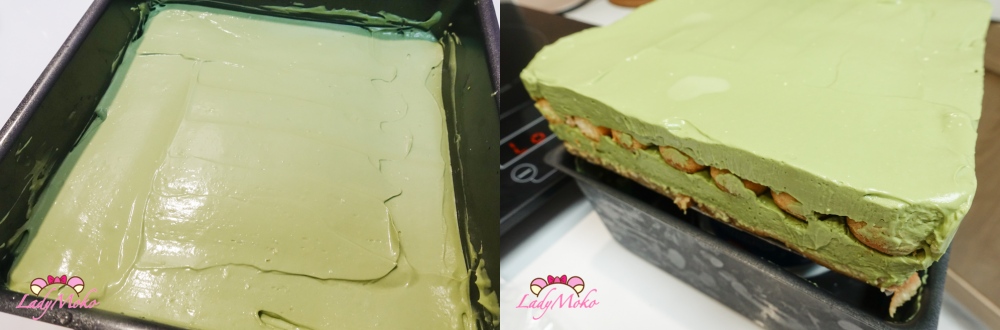 ⚡Tips 毛毛小撇步:本來想說可以將奶醬放入擠花袋中,用「擠」的方式填入,避免手指餅乾之間產生縫隙,因為我當時是直接用刮刀挖取奶醬放入,再將表面抹平,結果發現有縫隙的反而是下層的手指餅乾