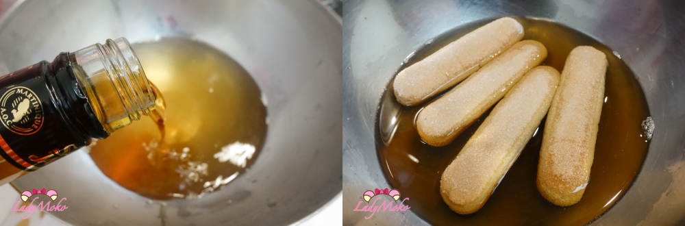 10. 將手指餅乾泡進蘭姆酒糖漿,要盡量浸透糖漿才會好吃,但也不要泡太久避免變得太軟爛。