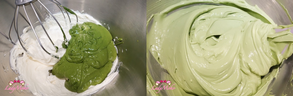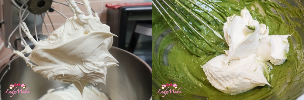 7. 再將抹茶蛋黃霜加入剩下的馬斯卡彭,一起攪拌均勻,提拉米蘇奶醬就完成了!