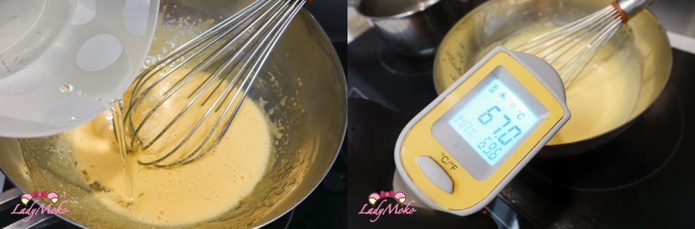 3. 隔水加熱蛋黃超過 70 度C,持續兩分鐘,蛋黃就殺菌完畢,就可以離開隔水加熱。