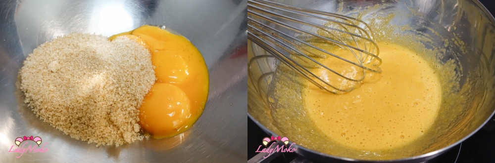 1. 將蛋黃和砂糖放入鋼盆內,並馬上用打蛋器打勻。(蛋白可以拿去做天使蛋糕或費南雪)