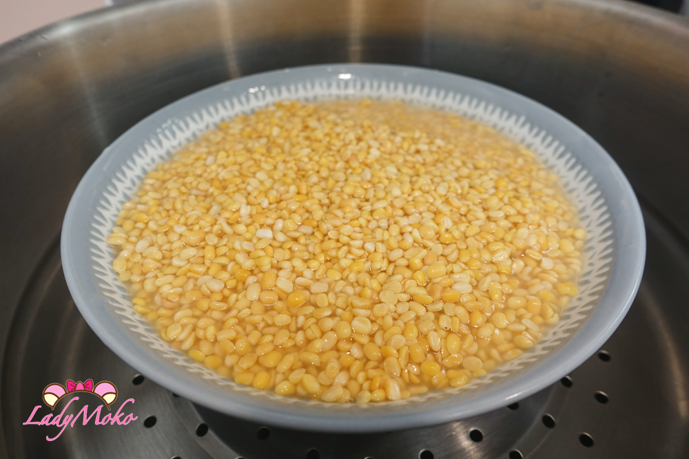 綠豆仁蒸的過程會吸收大量水份,所以蒸綠豆仁的水量至少要是綠豆仁的 2-3 倍,