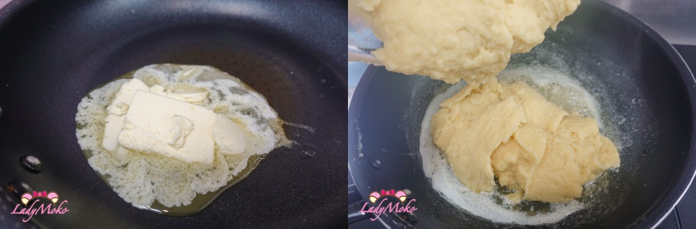 9. 熱鍋後將奶油融化,倒入打碎的炒綠豆仁泥,攪拌攪拌,就可以開始炒綠豆仁啦!