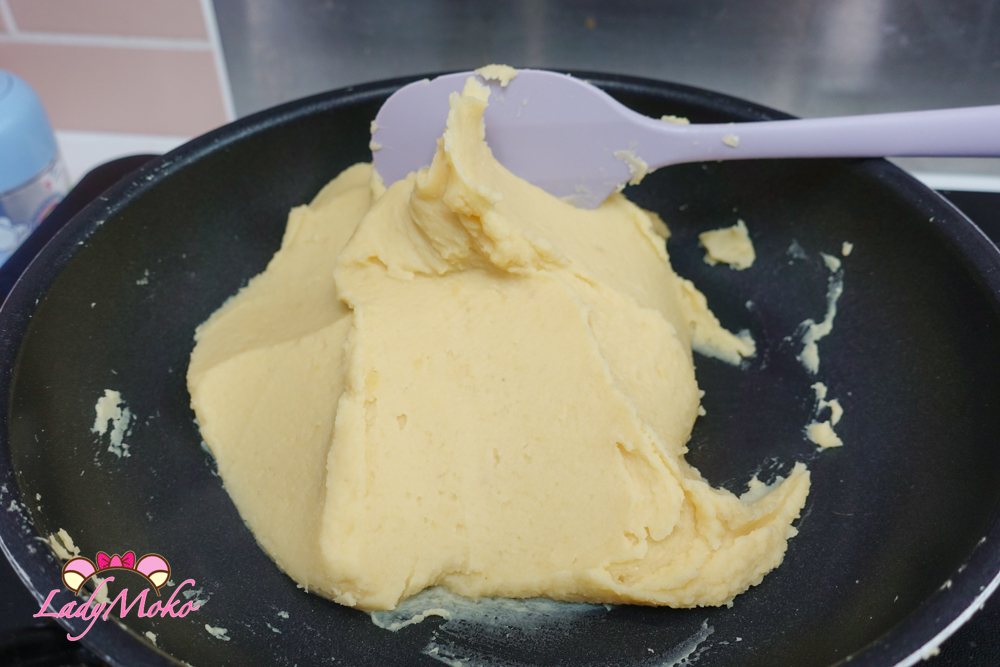 炒到不會流動、可以弄成一個尖尖的塔,就可以了!冷掉之後也會再變更硬一些,所以也不會炒到過乾。