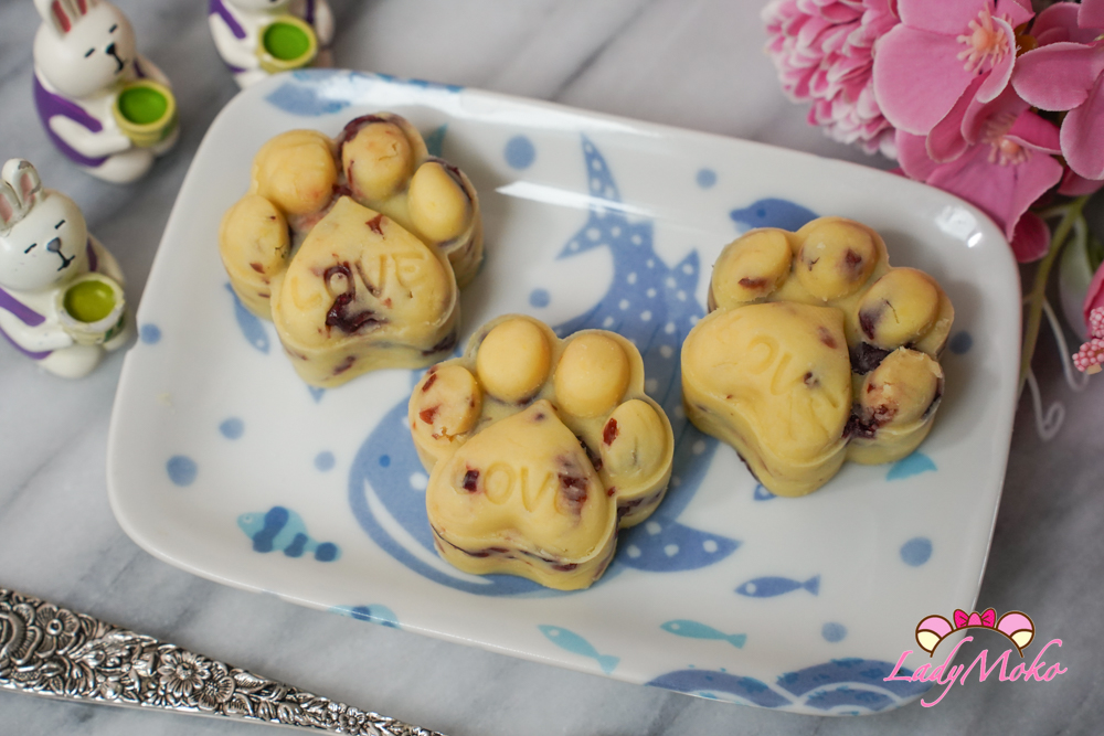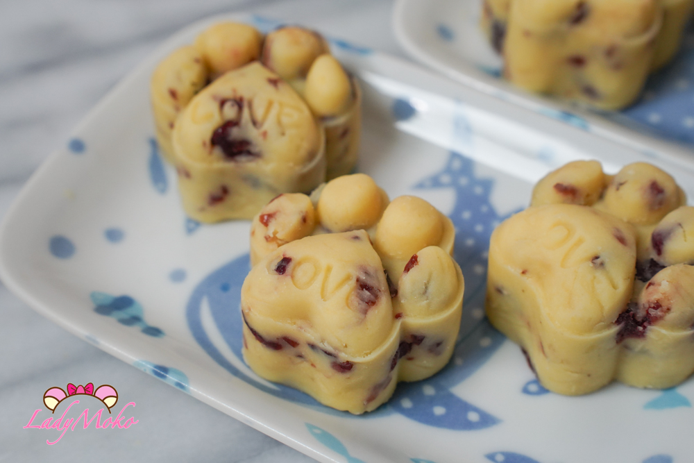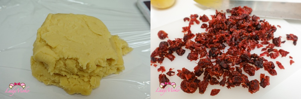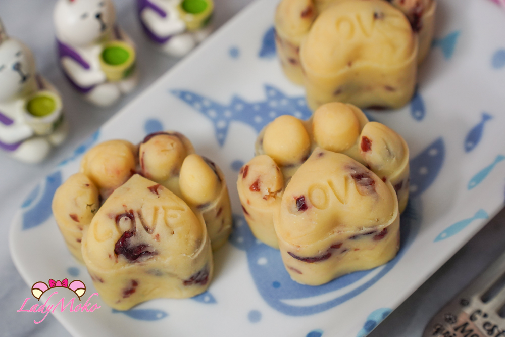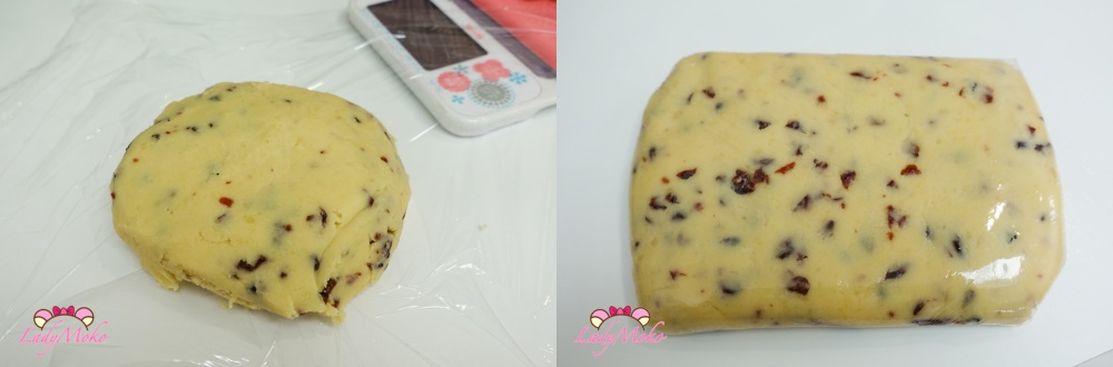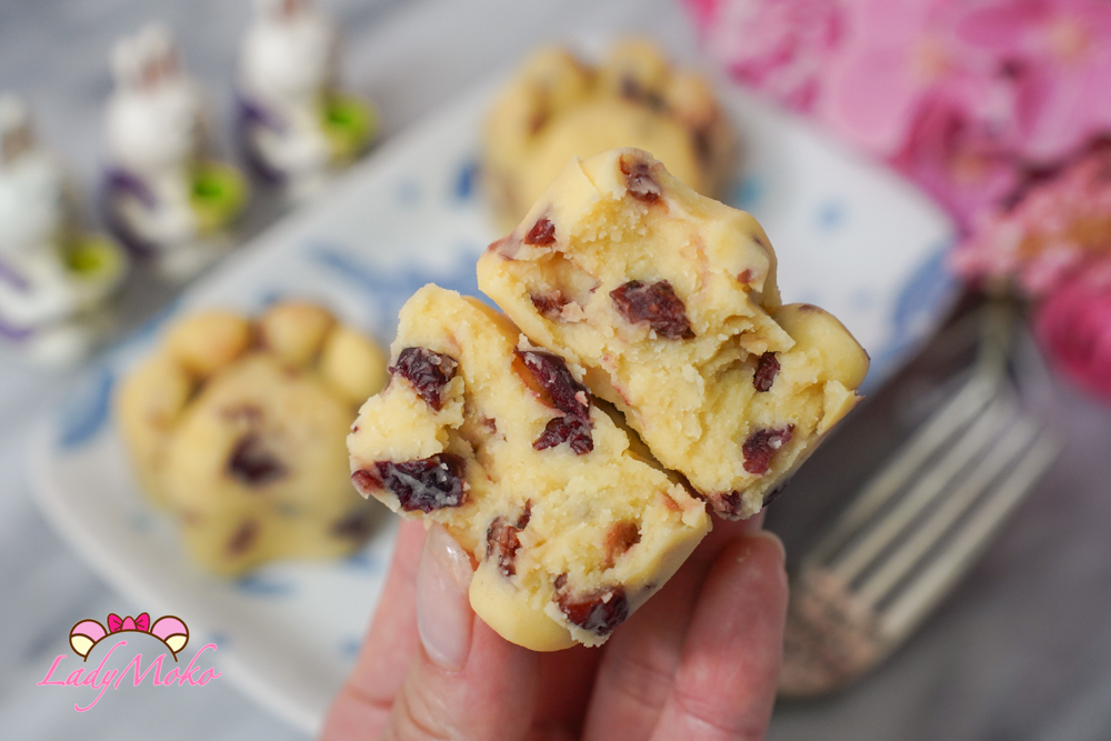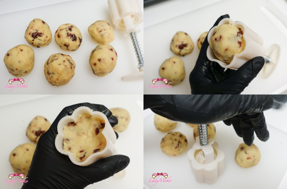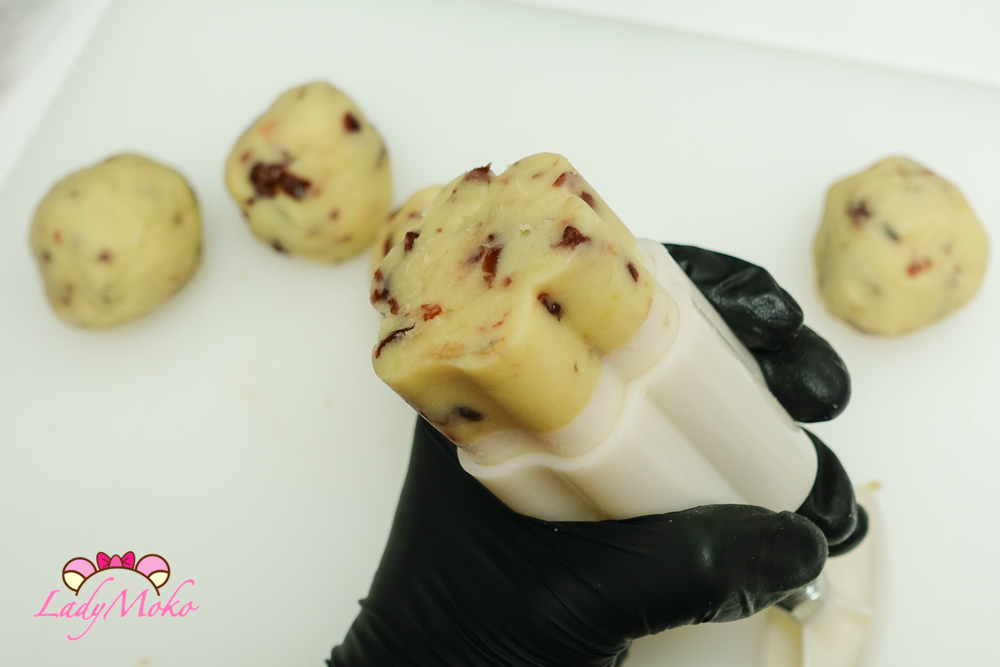 蔓越莓建議切得越碎越細小越好,不然在入模的時候,太大塊的蔓越莓會影響壓模。