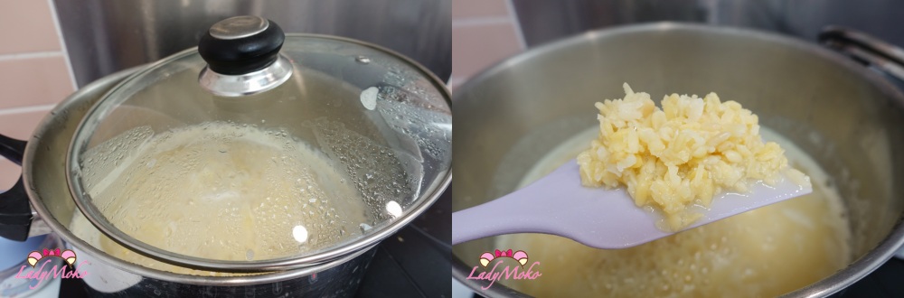 5. 煮的過程可以將鍋蓋半掩,如果整個蓋上會讓水沖上去,半掩悶煮可以加快煮綠豆仁的速度。