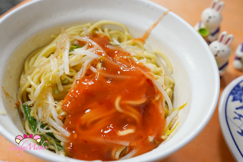 乾麵是使用傳統黃油麵,搭配豆芽、韭菜、油蔥,再淋上一匙古早味甜辣醬。