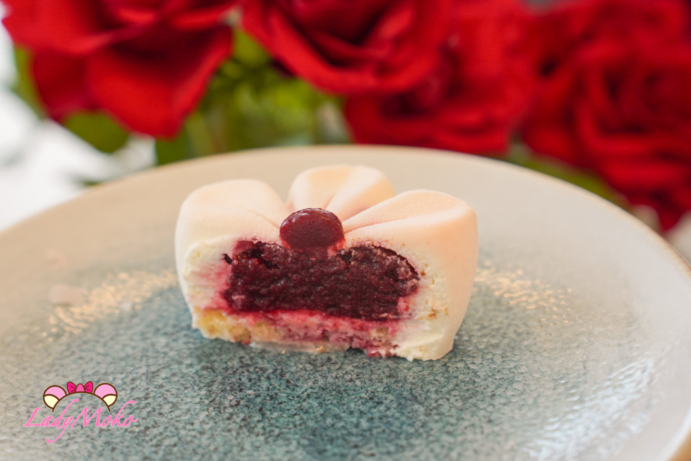 最上層則是以 Mélissane 香草品牌的玫瑰天竺葵(Géranium rosat)浸泡製成的慕斯,花香細緻優雅,清新不厚重,與櫻桃的果酸形成完美平衡,讓整體甜點在細膩中展現獨特記憶點。