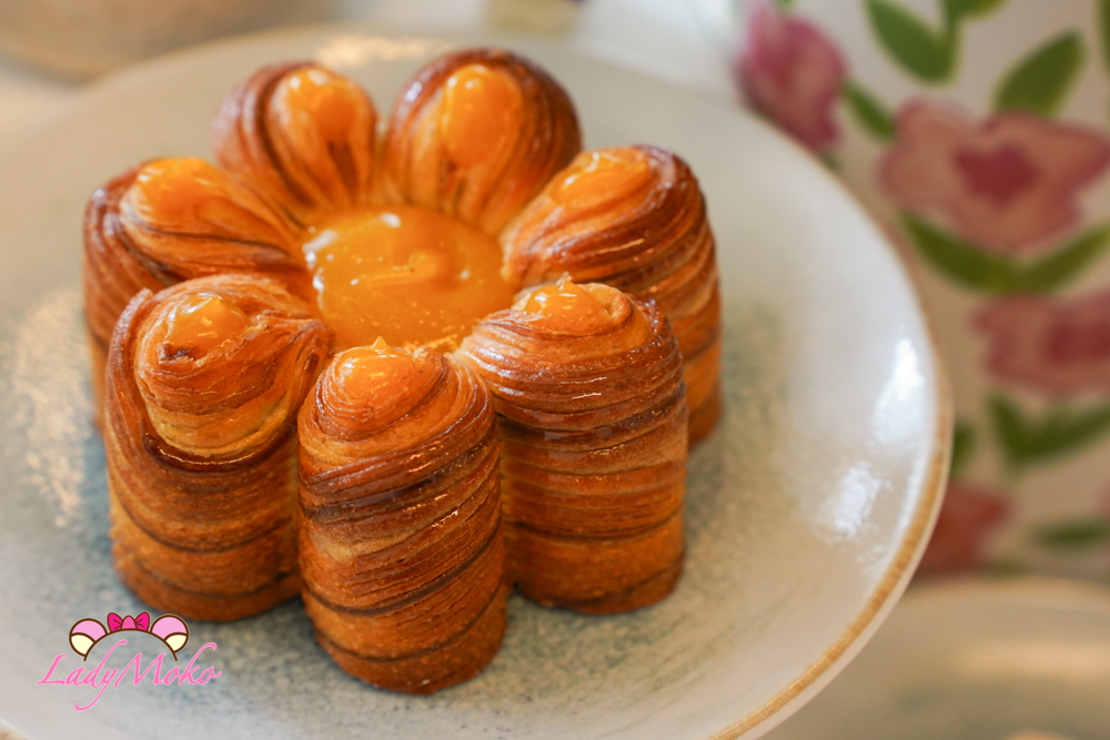以 Montaigu 產區 100% 純奶油製作的可頌式布里歐修(brioche feuilletée) 為基底,層層摺疊出的酥鬆結構,兼具布里歐修的柔軟與可頌的酥香,入口同時感受到濃郁奶油香氣與細緻層次。