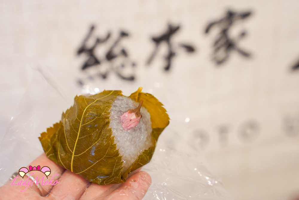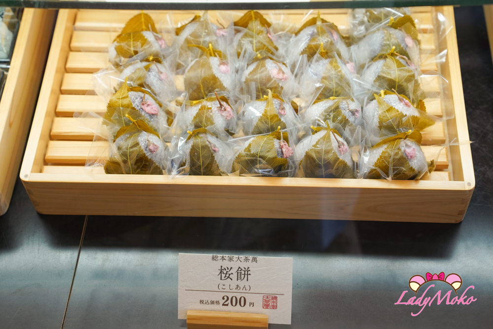 総本家 大茶萬」有販售櫻餅,堅持不加任何色素與添加物的「総本家 大茶萬」,櫻餅呈現的是原本道明寺粉的白色,沒有多添加粉色染色。