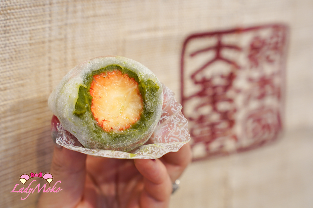 本來在款與超大草莓抹茶大福間抉擇,還尋求店員的建議(選擇困難症的人真的很需要建議),店員說大款的草莓比較不甜,但視覺上很澎湃,所以最後還是選了一般款的草莓抹茶大福。