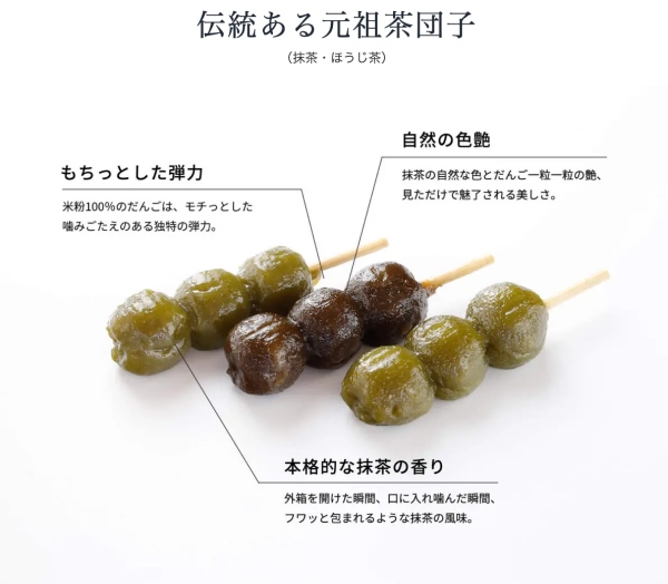 総本家 大茶萬」的糰子可是大有來頭,名為「元祖茶糰子」,使用與宇治當地合作茶園特別為糰子製作調配的抹茶粉,100%使用日本產米粉,不含任何的色素與保存劑,也因此這款茶糰子的最佳賞味期限只有短短兩天,每一顆糰子都次職人一顆一顆搓揉製成。店內提供抹茶與焙茶兩種口味。
