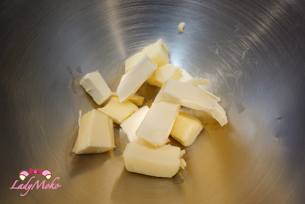 那天我退冰奶油退冰了一整個早上,下午3點多才開始來做磅蛋糕,奶油的質地是「出點力就可以壓出指痕」的程度,