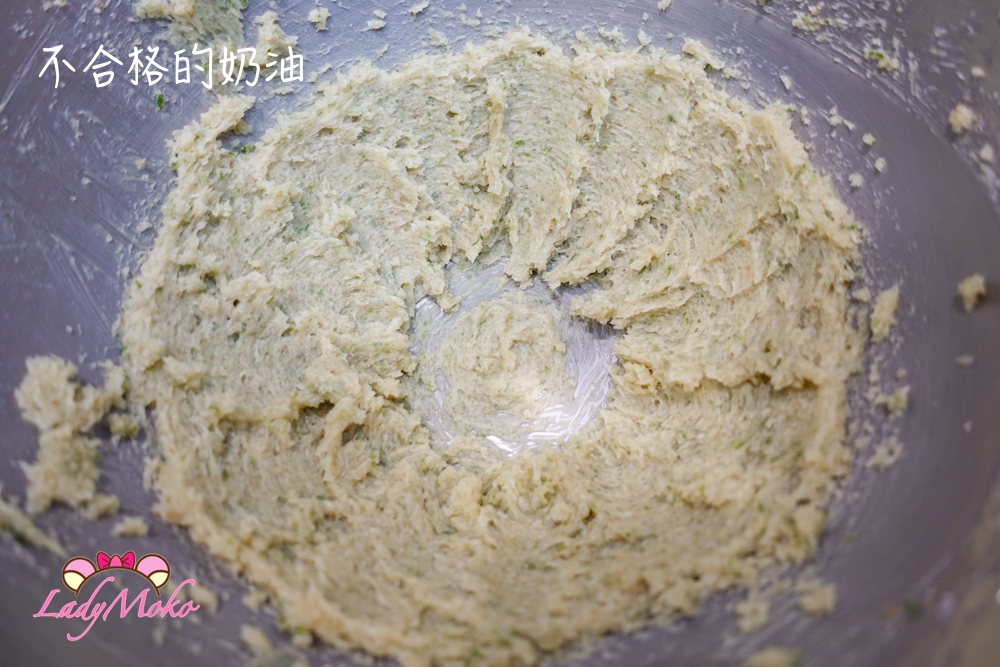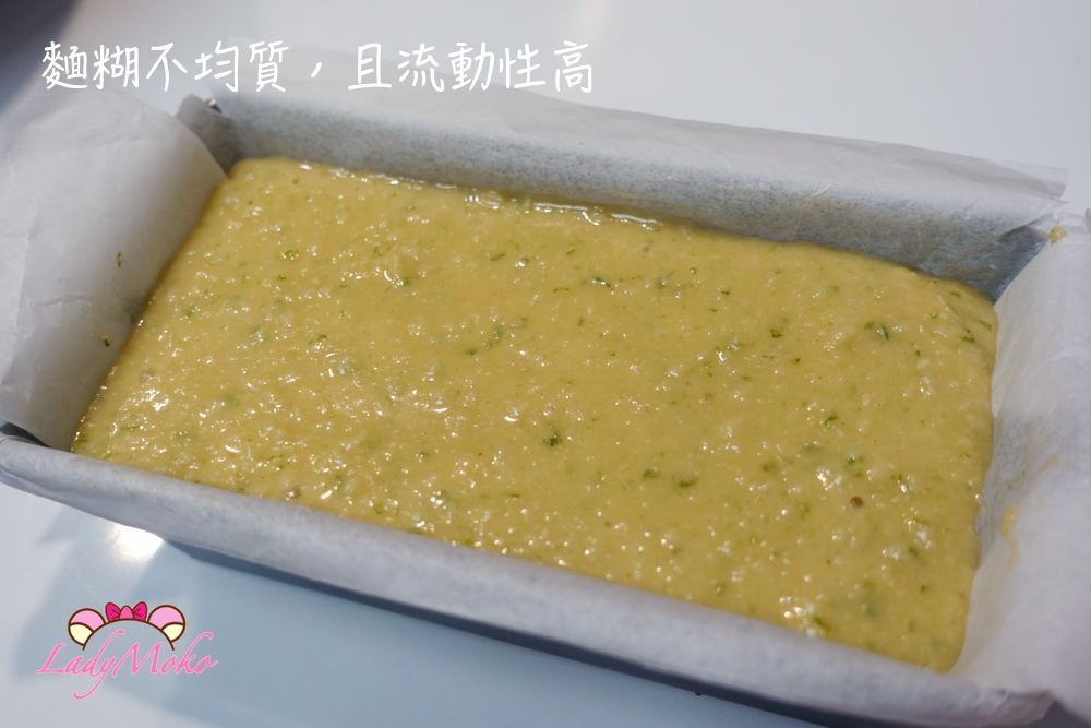 依序後續食材:雞蛋、麵粉等,結果檸檬口味的麵糊呈現非常水狀、流動性高,可以清楚看到奶油的顆粒漂浮,這種真的不要硬烤,成品吃起來像吸水海綿,真的不行。