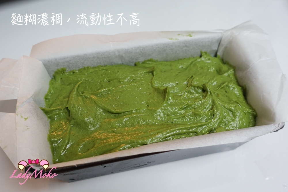 抹茶口味的麵糊,很明顯就是呈現非常濃稠的狀態,流動性不高,均質、無顆粒,這樣才是好的磅蛋糕麵糊。